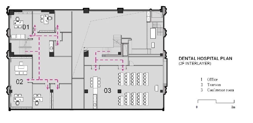 室內(nèi)的墻面具有不同的透明度:從等候區(qū)域可以看到接待臺后方的診區(qū);實驗室和器材消毒中心的部分玻璃隔墻覆蓋以半透明的白色薄膜,為醫(yī)務(wù)人員提供了半私密的工作環(huán)境。傳遞了診所公開透明的理念。